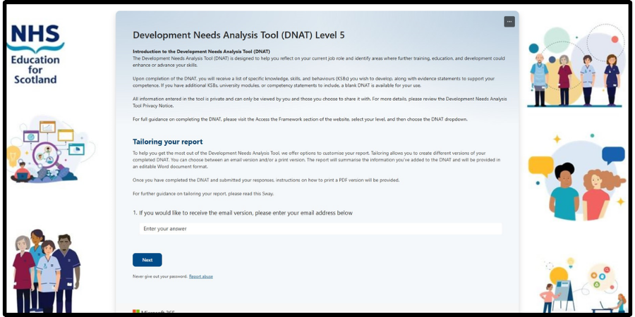 If you are completing the DNAT in full it will take approximately 3 hours to complete. It is recommended that you complete one pillar at a time then save, this will take approximately 45 minutes to an hour per pillar. To save your responses you need to be signed into your Microsoft 365 account. For more information on how to do this, please read this guidance.