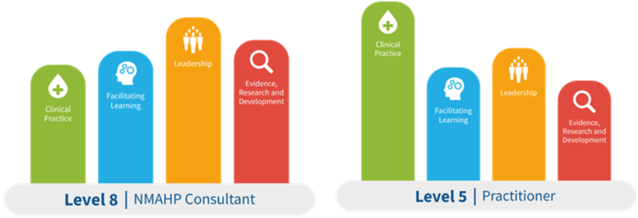 For example, the emphasis may be on the Clinical Practice Pillar for a practitioner at Level 5 whereas at Level 8, the Leadership Pillar may predominate (Figure 1). A practitioner in a specific role, such as a Practice Educator, will give more emphasis to developing the knowledge, skills and behaviours associated with the Facilitating Learning Pillar than a practitioner at the same level working in a clinical role.